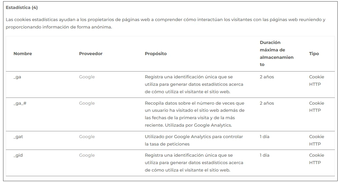 Nota: Las cookies de tipo “Propias” son utilizadas sólo por el propietario de esta web y las cookies “De terceros” son utilizadas, también, por el prestador del servicio que está detallado la tabla anterior.